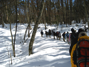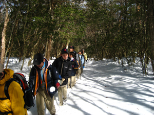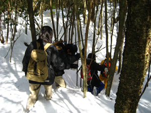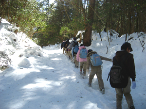 | 深い雪の中を、進みます。 道があるところばかりではないので、 コンパスを使ったり、 3点直進法で進みます。 班のまとまりが大事です。 |