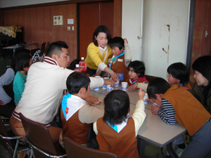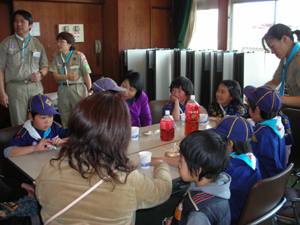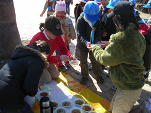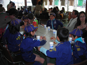 | パレード後は 紅白餅とジュースを頂き ご機嫌のスカウトたち。 |
