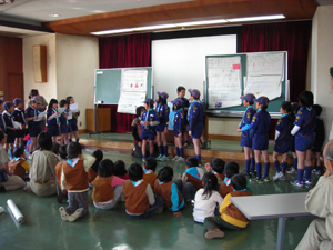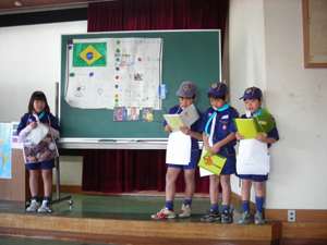 | 最後はみんなで、 世界の国を紹介する替え歌を歌いました。 みんな良く調べたね、 楽しかったよ!! |