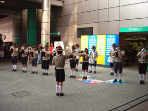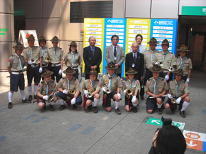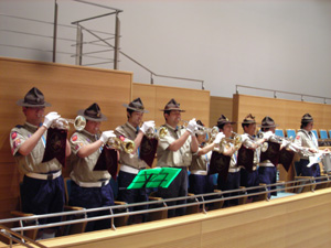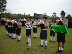 | そこで、警報が出る前に 奉仕のために集合していた 年長のスカウトと、リーダーで 開会式のファンファーレを吹奏。 相当さびしい陣容です。 |