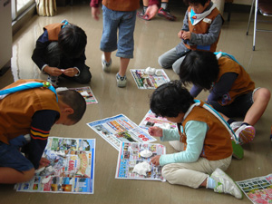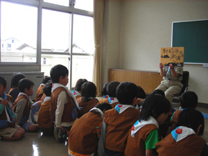 | 今日は雨・・・ 室内プログラムです。 まず、紙芝居 みんな真剣に聞いています。 |