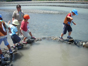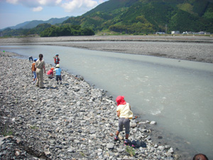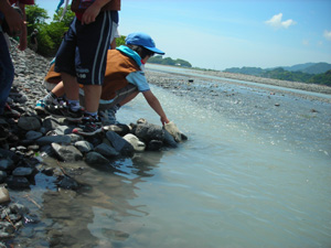 | 安倍川で石投げ大会。 ビックビーバーは、 水切りにも挑戦。 なかなか難しいぞ!! |