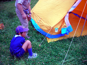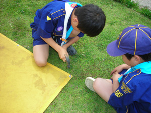 | カブ隊は、キャンプに向けてテント張りの練習です。 うさぎスカウトはペグ打ちも初体験! 金鎚の数が全員分はないので、他のスカウトが打ち終わるのを待ちます。 家型テントは、ドームテントと違って協力しないと 簡単には張れません! |