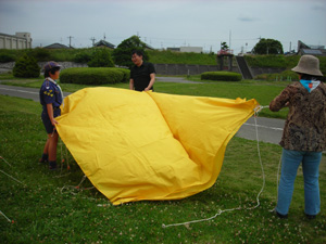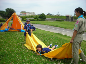 | 今日は、メキシコからもお友だちが 見学に来てくれました。 夏休みを利用して 遊びに来ているそうです。 メキシコで ボーイ隊に所属しているそうです。 落ちている棒などでも テントを張るそうです!! スゴイ… |