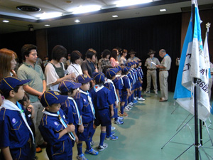 | カブ隊のやくそくをたてます。 隊旗が見えなくなるくらい大勢で。 この仲間を、いつまでも大切にね。 |