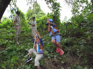 | ビーバー隊は、カブ森へ。 ロープを張って、ターザン気分です。 |