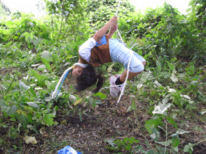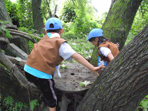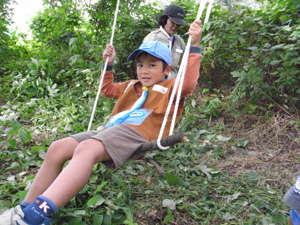 | 元気いっぱいに、 自然の中で遊びました。 ロープをしっかり握るので、 みんな、手が真っ赤でしたよ。 |