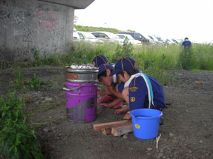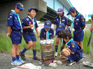 | カブ隊はキャンプに向けて 炊事の訓練。 |