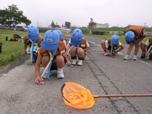 | 片付け後は、安倍川に 朝の安倍川で体を動かしました。 |
