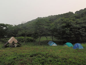 | 翌朝の点検です。 テントの乾燥も大事な事。 隊の資材を大事に使うため、 乾燥は欠かせません。 |