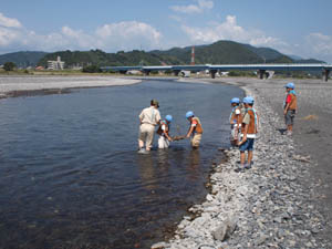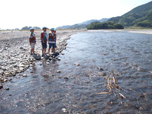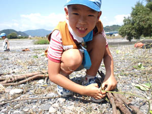| 安倍川の 河原に有る材料を工夫して 船を作りました。 |