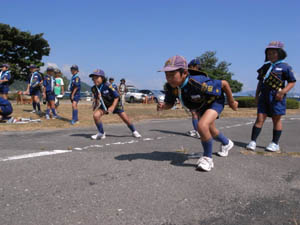 | 次に、ビーバーから カブへの上進。 ビーバー隊長の「跳べ」の 声で、カブ隊へと、 元気いっぱいで ジャンプしていきました。 |
