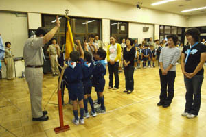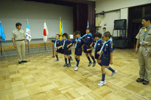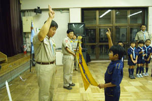 | 本日は上進式です。 先ずは、カブ隊への入隊スカウトの やくそく。 新しい仲間です。 うれしいですね。 制服が良く似合ってますよ。 |