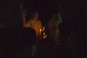 | スカウトにとって、最も大事な ちかいをたてます。 1本のローソクに一つのちかい。 火をともしながら、 3つのちかいです。 |