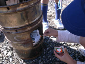 | その後は、燃焼実験。 河原で拾ってきたいろいろな 木材を、燃やしてみました。 簡単に火が着くもの、 煙ばっかりのもの、 火力が強いもの、 全く燃えないもの いろいろです・・・ |