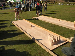 | この日は、 安倍川流木まつりが、 開催されていました。 木でできたボーリングをしたり 積み木を頂いたり。 |