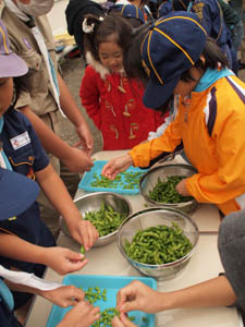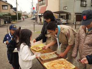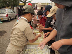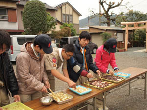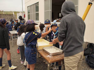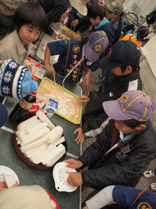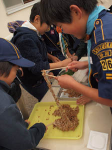 | カブスカウトも 準備を手伝います。 おもに、お餅に絡める食材の準備。 大根おろし、黄な粉、餡子、 枝豆、納豆・・・・・ バリエーションに富んでいます。 |