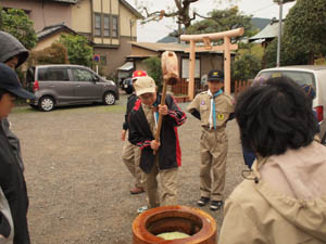 | 今日の集会は、毎年の恒例行事。 団の餅つきです。 今年は、松の木神社をお借りしました。 |