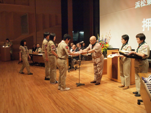 | 先ず、富士スカウトに進級した ベンチャースカウトの表彰が ありました。 当団からも、1名表彰者が出ました。 |