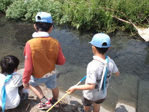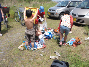 | 獲物は、アユ、ヨシノボリ、アユカケ? カワエビ、ヤゴ、ドジョウ等でした。 ずぶぬれの後は、自分で着替えます。 |
