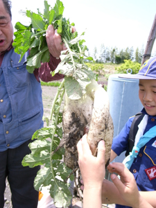 | 途中で、隣の畑の方が、 大根を持って登場。 とっても面白い形をしてます。 みんなも楽しみだね。 |