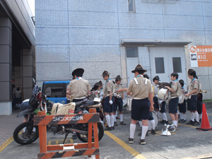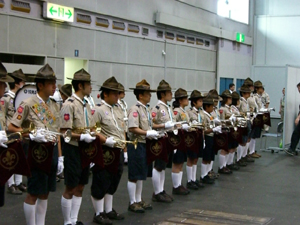 | 前日には、 トランペット鼓隊の演奏もありました. 何と開会式での国歌吹奏、 そして静岡地区の自転車キャラバン隊 帰着報告の伴奏。 大変名誉な事でした。 なお、写真は大阪連盟の役員で ジャンボリーで、いつも、 大変お世話になっている方からの ご提供です。 ありがとうございます。 |