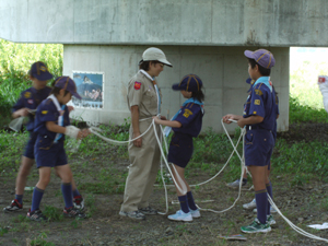 | カブ隊は、ロープワークの訓練。 引き解け結び等を修得して、 ゲームをしました。 新しいことを覚えるって 素敵ですね。 |