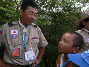 | 隊長を見つけて、 ジャンボリーの話を聞きました。 この後、プログラムの様子を 見学しました。 地区のみんなでバス5台、 楽しかったですね。 |