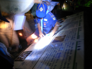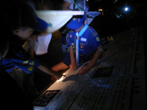 | カブ隊は、1泊舎営 夜間ショートハイク。 行き先は古墳・・・・ 肝試しではありません。 計測作業です。 |