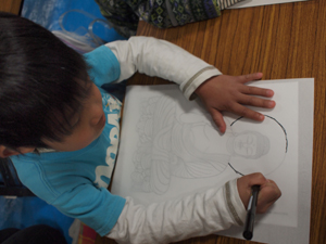| 仏様を、写し絵で描きます。 心を落ち着かせて、紙に向かいます。 |
