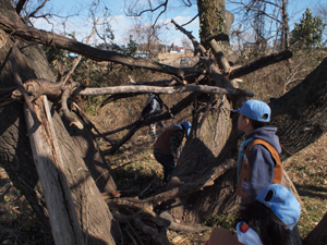 | その後は、カブ森の秘密基地へ。 本日の進捗具合です。 スカウトが乗れる台が完成しました。 工事はこれからも続きます。 |