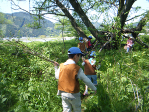 | 緊急時なので、普段の集会のような 道具の準備をあまりしません。 薪も現地調達です。 |