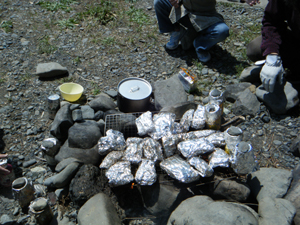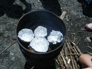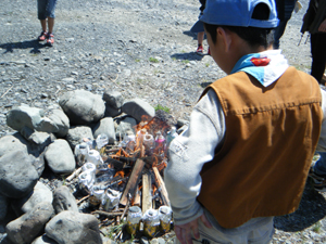 | さらにカブ隊は、アルミホイルを 鍋代わりにして 味噌汁を作りました。 前回、失敗した経験が、 今回は成功につなっがったね。 |