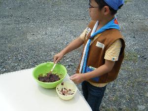 | 副長から作り方の説明を受けます。 今回は草団子ですが、 中に入れるヨモギは、 春に、スカウトが摘んだものです。 |