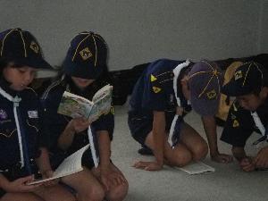 ![]() | 台風の影響で 今日の集会は、室内に変更。 世界ジャンボリーに参加した先輩の お土産のクッキーで、 ティーパ−ティーです。 |