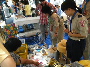 | また、地区のベンチャースカウトが フリーマーケットに出品しました。 環境問題を考え、 家にある不要物を販売して リユースする事により ごみを減らそうと言う企画です。 |