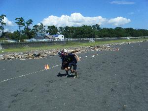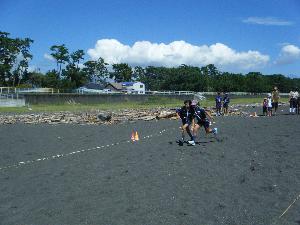 サンダル飛ばし。 ”人"字レース 2人組になり、”人"の文字の形になって 走ります。 新しいゲームですね。 砂浜だから転んでも大丈夫。 |