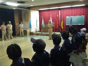 | スカウトたちも真剣に 整列します。 学校で言うと、入学式と 卒業式を一度に行っている感じです。 |