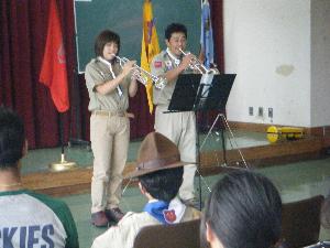 | 上進式が終わり引き続いて 育成会総会です。 今回は特別に 団からのプレゼント。 プロオーケストラの トランペット奏者であるVS副長の 演奏です。 とってもきれいな音色でした。 (ビーバー隊長はおまけ・・・) |