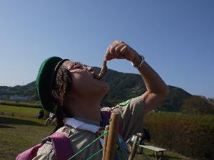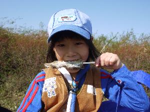そして、恒例のお楽しみ アユの塩焼きです。 頭からガブッ!! 普段魚を食べないスカウトも 美味しいと言います。 |