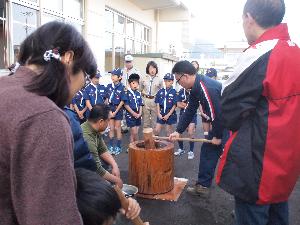 いよいよ 餅つきです。 お手伝いの お父さんが大勢、 駆けつけてくれました。 どうもありがとうございます。 |