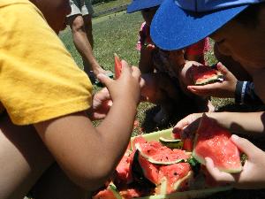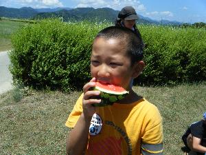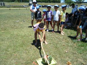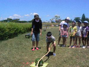 | スイカ割り スカウトみんなの力を合わせて、スイカを割りました。 写真に写っているスカウトは、地球ではなく、スイカを叩いた栄光のスカウトです(笑) |