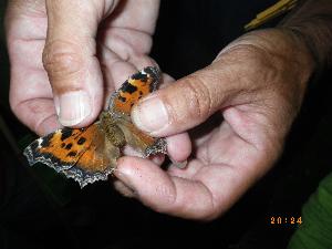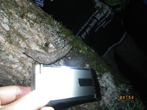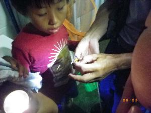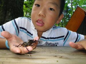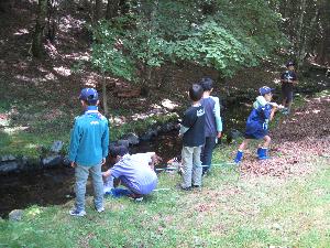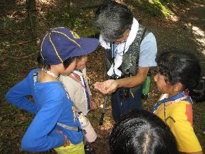 | また、今回は、自然観察のインストラクターをお招きしました。 さすがに、色々な生物を発見して、スカウトに教えてくださいます。 この赤い脇腹のガマガエルは、井川にしかいないそうです。 |