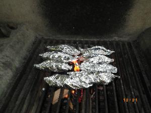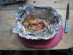 | カマドで、更に大きくして | 炊事に用います。 | これは、ホイル焼き。 火の有難さを感じます。 とにかく、火お越しは大変です。 |