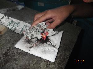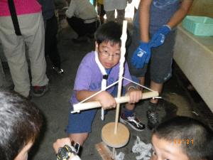 | 今回は、炊事がメインテーマ。 | 火も自分で作ります。 | 火お越し器で種火を作り・・・・ |