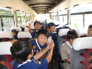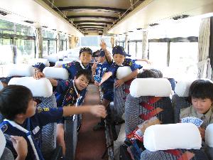 | カブ隊キャンプ バスに乗って井川県民の森に。いよいよキャンプの始まりです。 |