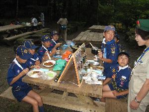 | そして、美味しい朝食 お腹が痛くなるまで食べたスカウトもいました。 |