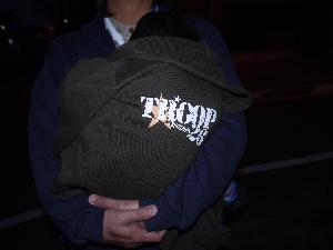 | こちらは、 団のロゴ入りパーカに 身を包んだ ボーイ隊副長の ご子息 早く起こされてご機嫌斜め |