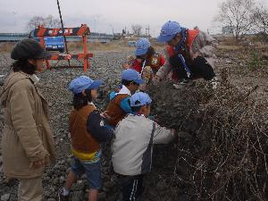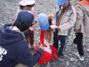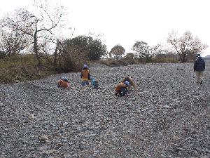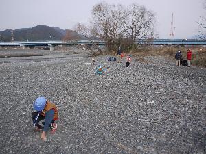 | 河原の石の裏に 当たりが隠されています。 スカウトたちは必死で探します。 |