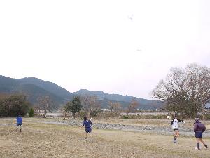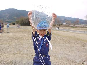 カブ隊は、元気いっぱい。 凧上げです。 少しでも高く上げよと 河川敷の運動場を 思いっきり走っています。 |